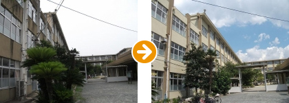 夏休みを利用して校舎の改修工事がおこなわれています。築年数の経過した校舎は劣化が激しく大変危険です。調査をおこない危険な壁に補修を施し塗装して外壁を塗り替えます。休み期間中に終わらせないといけないので、とても大変な工事です。