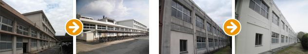 1棟が幅96メートル、2棟合わせると幅192メートルとかなり長い校舎です。建物もかなりの年数が立ち劣化が進行しておりましたが、改修後は見違えるほど綺麗な校舎になりました。