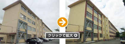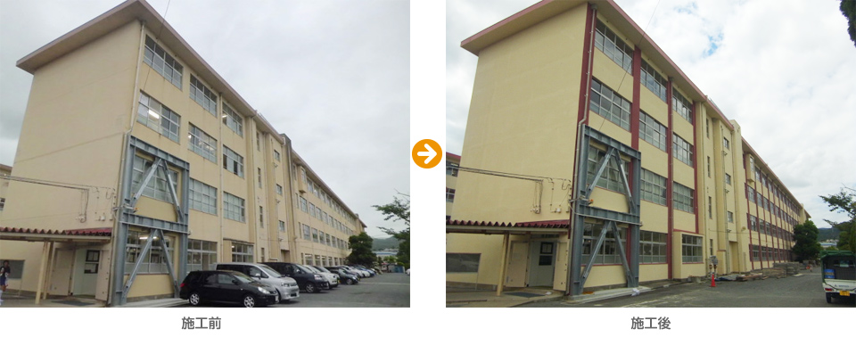 毎年恒例、夏工事の大規模改修。2棟の校舎、体育館、渡り廊下、I中学校全ての建物7,500㎡を夏休み期間中に仕上げました。短い工期の中で無事に竣工を迎えました。