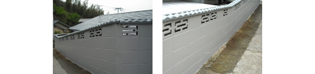 その後上塗りを2回塗りして完了です。色は塀が薄いグレーで上の笠を濃いグレーで塗装し2色の色替えでした。笠部が外れているとこは落下の危険があるため、モルタルで補修をしました。