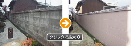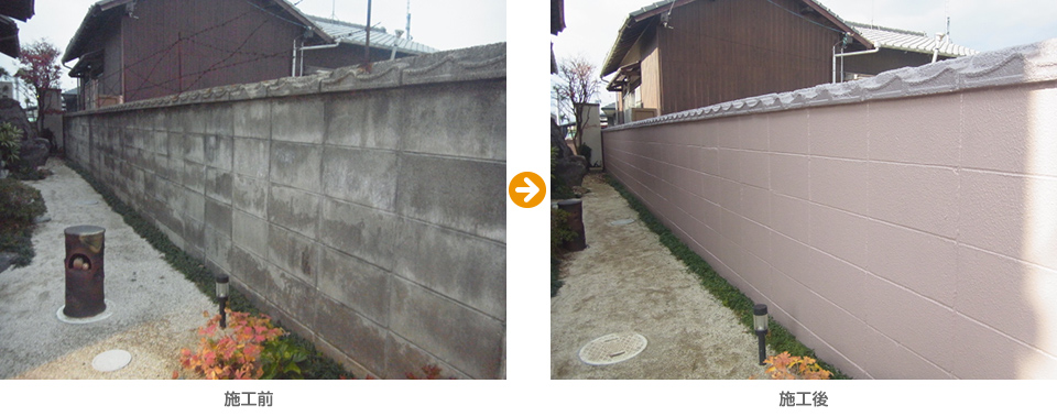 ブロック塀は長年の汚れで外観のイメージを損ねておりました。「時間のある時でいいから」とS様のご厚意に甘え、時間をかけ丁寧に施工させていただきました。完了後はS様ご夫妻に大変喜んでいただけました。