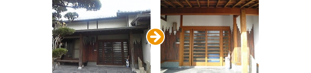 最初は染み抜き剤で白木にして完了でしたが、施主様のご希望により着色させていただきました。外壁と木部との統一感がでて素晴らしい玄関になったと思います。