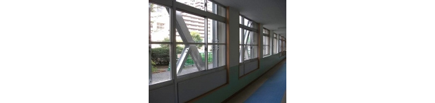 外壁に耐震ブレス(鉄骨)を取り付けましたので内壁も解体されて再度、壁・サッシ・枠・防火鉄扉などが新しく復旧されました。復旧された壁・腰壁・木枠・巾木・防火鉄扉などを既存の色に塗装し、これまで通りの校舎にリフォームされております。