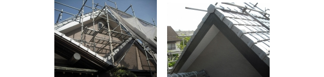 ビス穴・すきま等の古いパテ跡やシーリングを除去し、新しくパテとシーリングで補修させていただきました。外壁や屋根などに塗料が付着・飛散しないように全て養生をして、ケレン・清掃後に塗装です。