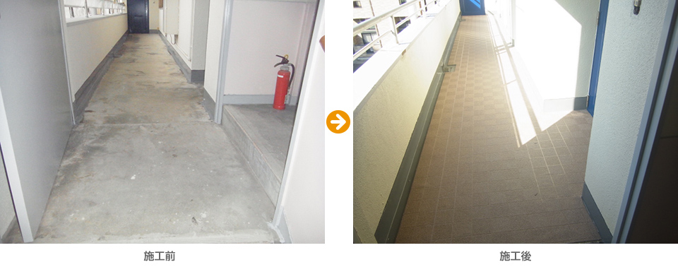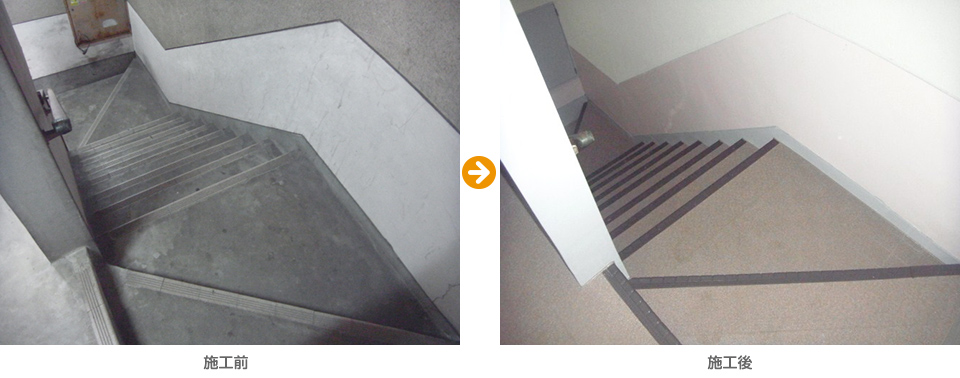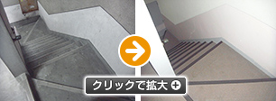 寒々しいコンクリートの階段室や共用通路の床が、高級感のある綺麗な床に生まれ変わりました。