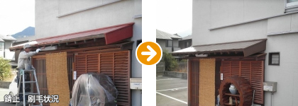 庇は泥や埃などが溜まりやすく、また雨水も溜まり錆が発生やすい箇所です。入念な下地処理を施し、錆止めと中塗り、上塗りの3回塗りで塗膜と艶を形成します。