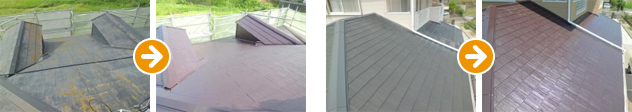 北九州市小倉南区のF様邸の屋根は外壁同様にコケ・藻が多く繁殖しておりました。原因は田んぼの湿気と空き地から吹き上がる風と山から吹き降ろす風の影響と考えられます。高圧洗浄でコケ・藻を完全に除去し、旧塗膜も剥ぎ落としました。