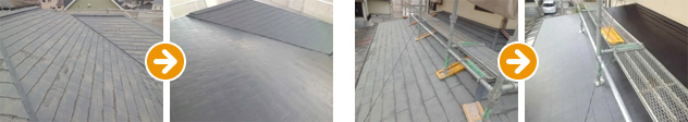 次に中塗りと上塗りを塗装して完了です。上塗り材は遮熱塗料のクールタイトsiをお選びいただきました。入念な高圧洗浄と下地処理を行い、確実にシーラーを塗布し、丁寧に上塗り材を2回塗りさせていただきました。施工不良で傷んだ屋根が見事に再生されております。