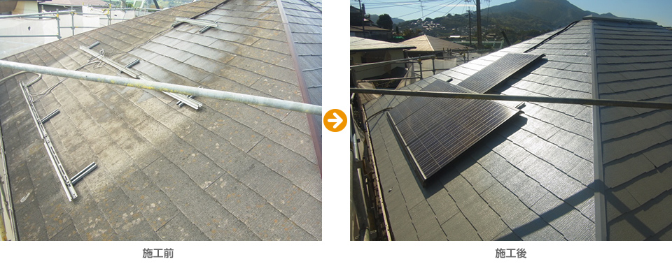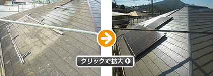 屋根に取り付けられた太陽光パネルは工事期間中、仮撤去させていただき、塗装後に復旧しております。 とてもきれいになった屋根をご覧いただき、M様にとても喜んでいただくことができました。