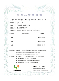塗装品質証明書はお客様に対して自社責任施工における弊社の責任と自信の証しです。